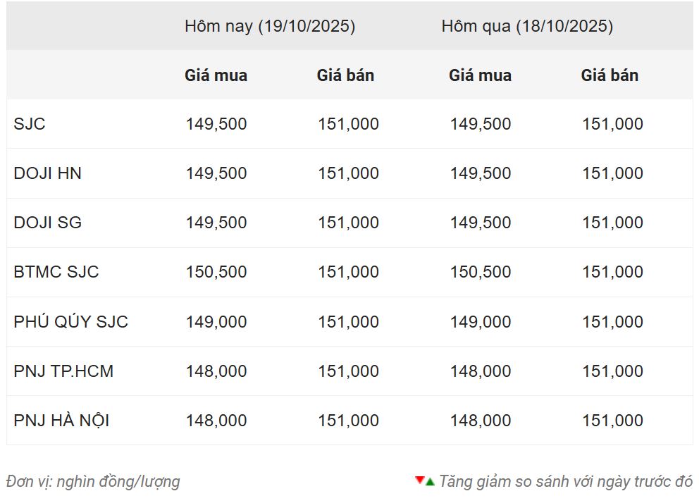 Theo giới phân tích, giá vàng trong nước hôm nay 19/10 có xu hướng giữ giá sau một tuần đầy biến động theo hướng tăng giá mạnh. Theo đó, giá vàng miếng SJC hôm nay 18/10 được dự báo sẽ về quanh ngưỡng 149,5 – 151 triệu đồng/lượng (mua – bán); tương tự giá vàng nhẫn cũng giữ giá, nhưng có thương hiệu hiện vẫn cao hơn vàng miếng SJC.