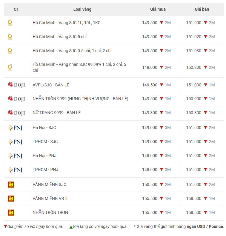 Trong khi đó, tại Công ty Bảo Tín Minh Châu niêm yết giá vàng miếng SJC mua vào ở mức 150,5 triệu đồng/lượng, bán ra ở mức 151 triệu đồng/lượng. So với cùng thời điểm phiên trước đó, giá vàng SJC giảm 2 triệu đồng/lượng ở cả chiều mua vào và bán ra. Hiện chênh lệch giá mua – bán vàng SJC đang là 500.000 đồng/lượng. Như vậy, trong tuần này giá vàng miếng SJC tại Công ty Bảo Tín Minh Châu đã tăng 9,7 triệu đồng/lượng ở chiều mua vào và tăng 8,2 triệu đồng/lượng ở chiều bán ra.